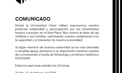 Universidad César Vallejo expresa su solidaridad con las víctimas del colapso en Real Plaza Trujillo. Se mantiene atenta para brindar apoyo a su comunidad universitaria. El...
