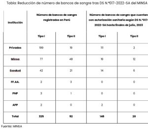 En setiembre pasado, durante el gobierno de Pedro Castillo, el Ministerio de Salud realizó una modificación del reglamento de la Ley de bancos de sangre en el Perú, mediante el DS N.°017-2022-SA, imponiendo un nuevo requisito que obliga a los bancos de sangre a tener una producción mínima para obtener su acreditación. Sin embargo, debido a la naturaleza actual del sistema de salud, este requisito es muy difícil de cumplir para la gran mayoría de bancos de sangre, principalmente los del sector público.